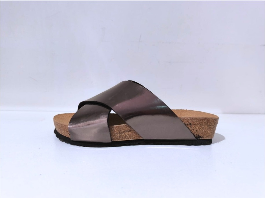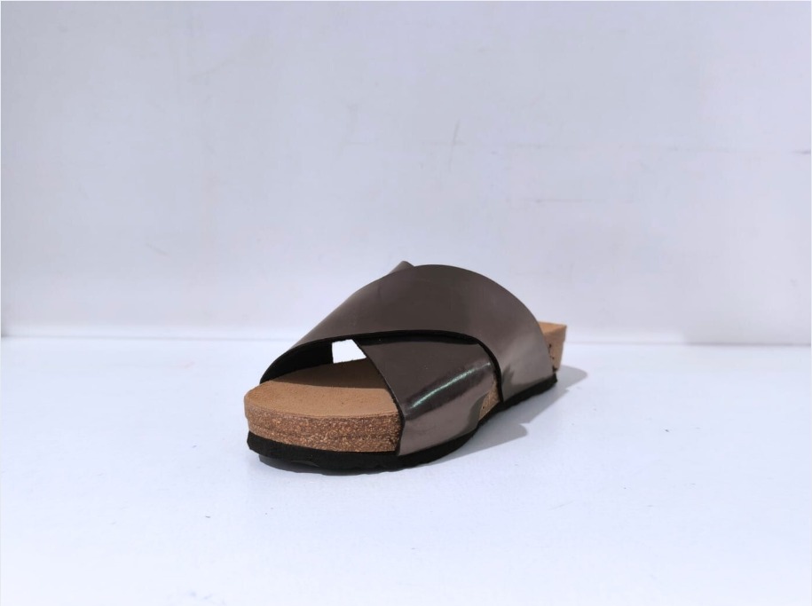 Sandalia Bio con diseño anatómico y estilo sobrio. La suela está fabricada en corcho natural, moldeada para adaptarse a la forma del pie y ofrecer comodidad prolongada. La base de goma negra con relieve proporciona tracción y estabilidad. El empeine presenta dos correas anchas en tono plateado oscuro con acabado metálico, cruzadas en forma de “X” sobre el pie, aportando un toque moderno y elegante. Su diseño minimalista la convierte en una opción versátil para el día a día. Ideal para quienes buscan un calzado saludable, cómodo y con carácter, esta sandalia combina funcionalidad y estética contemporánea.
