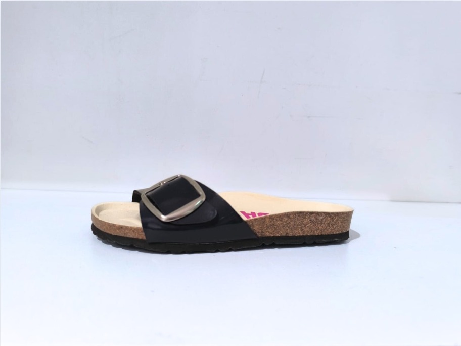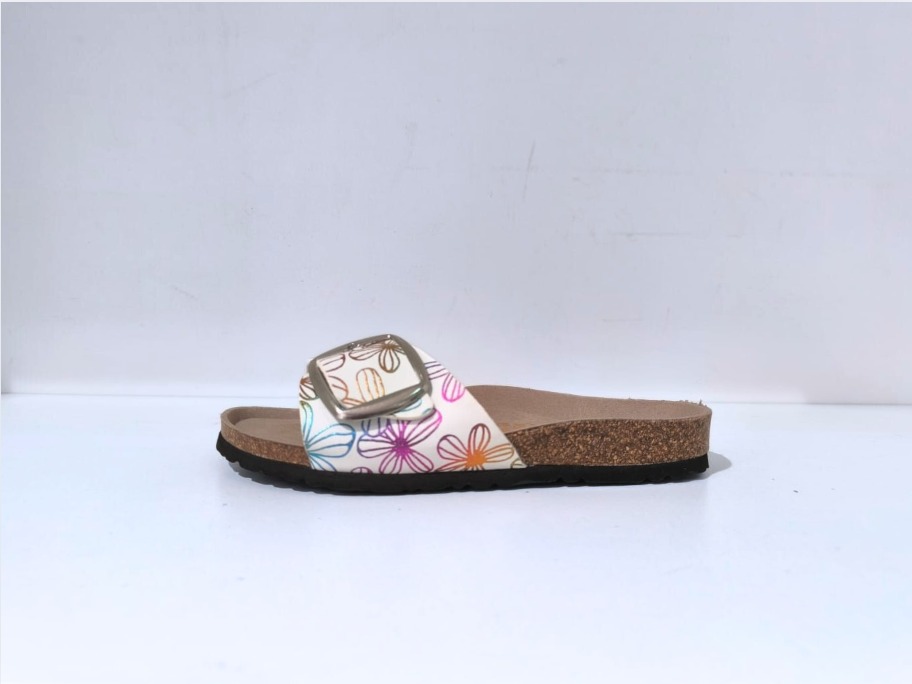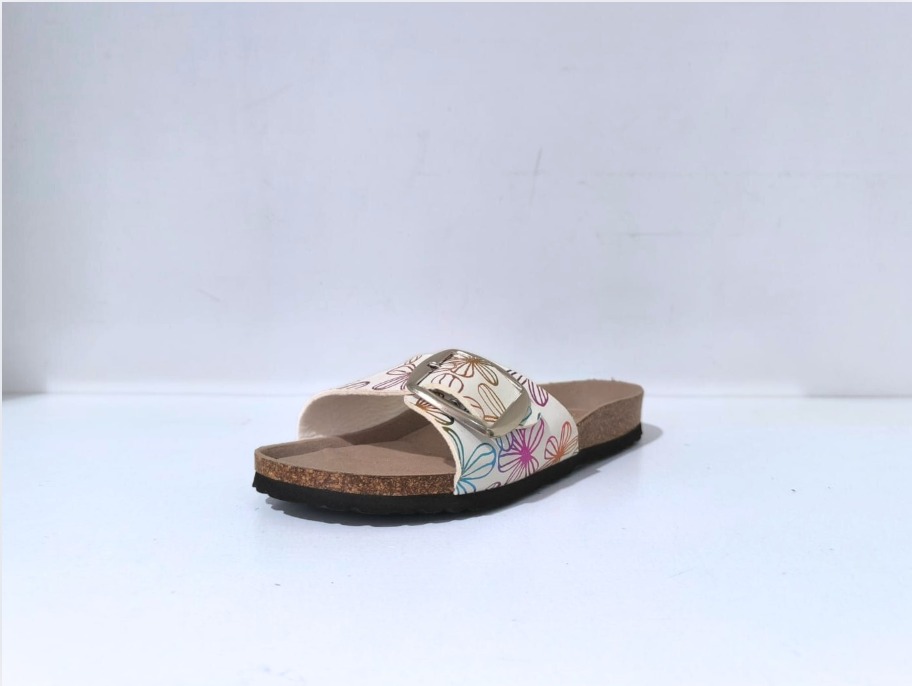 Sandalia tipo slip-on disponible en dos versiones que equilibran estilo y funcionalidad. La primera presenta una parte superior blanca con estampado floral multicolor, ideal para looks alegres y veraniegos. La segunda, en negro liso, ofrece una opción sobria y versátil para estilos más neutros. Ambas cuentan con una correa ancha ajustable mediante broche metálico, suela de corcho natural que aporta ligereza y confort, y base de goma negra con relieve para mayor tracción. Este diseño combina comodidad y estética, adaptándose a distintas personalidades y ocasiones. Perfectas para quienes buscan un calzado práctico sin renunciar al estilo propio.