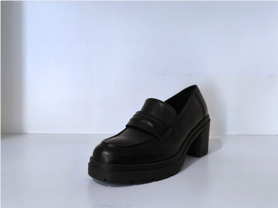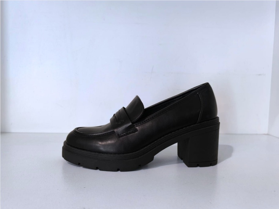 Mocasín de mujer elaborado en cuero sintético negro de alta calidad, con un diseño clásico renovado que combina elegancia y comodidad. Presenta una punta redondeada, empeine con antifaz decorativo y una suela robusta con tacón ancho que brinda excelente estabilidad al caminar. Su interior suave y la plantilla acolchada garantizan confort durante todo el día. Ideal para looks formales o casuales, este mocasín con tacón añade un toque moderno y sofisticado a cualquier conjunto.