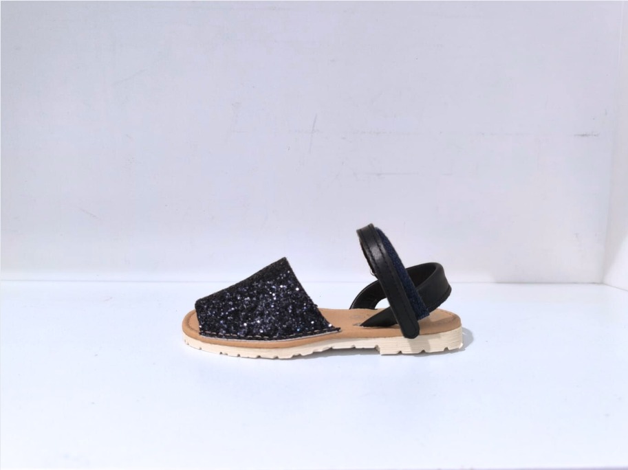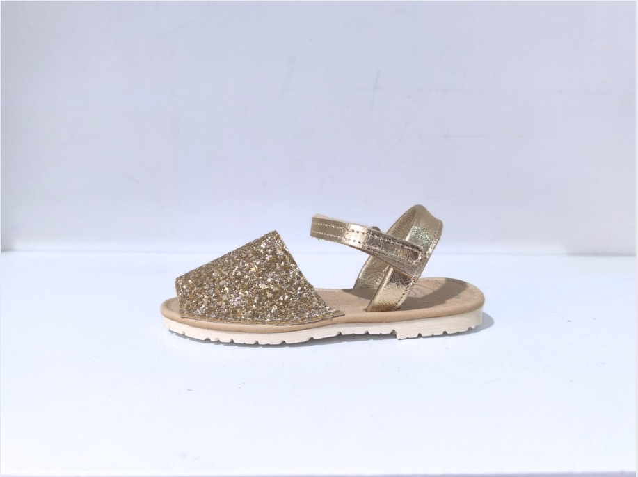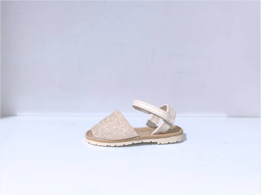 Sandalia infantil disponible en tres versiones: negro, blanco y dorado, pensadas para combinar estilo y comodidad en los más pequeños. Cada modelo cuenta con una suela de goma blanca con relieve, que proporciona buen agarre y estabilidad. El interior es acolchado en tono beige, suave al tacto y cómodo para el uso diario. La tira frontal destaca por su acabado brillante: glitter negro para un look moderno, blanco para un estilo limpio y dorado para un toque festivo. La correa trasera asegura el pie con firmeza. Perfectas para paseos, juegos o eventos, estas sandalias combinan funcionalidad y encanto infantil.