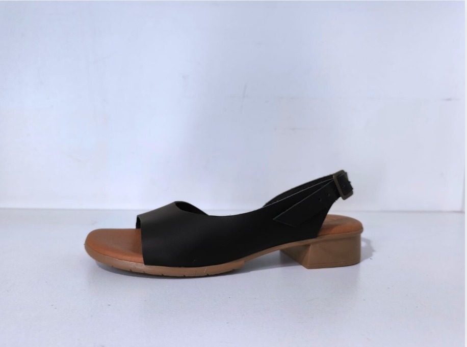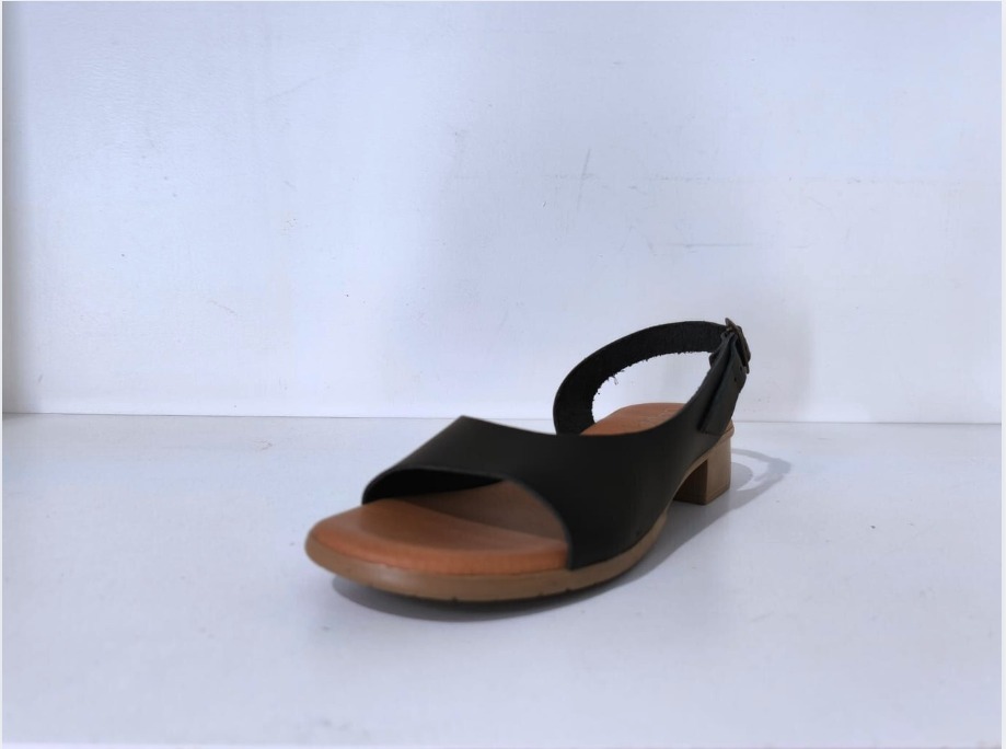 Esta sandalia de tacón bajo con hebilla destaca por su diseño sencillo, moderno y cómodo. Fabricada en material sintético de acabado liso, cuenta con una tira ancha en la parte frontal que brinda buena sujeción y una correa trasera ajustable con hebilla para un ajuste perfecto. Su tacón cuadrado bajo proporciona estabilidad y comodidad, ideal para usar durante todo el día. Disponible en color negro.