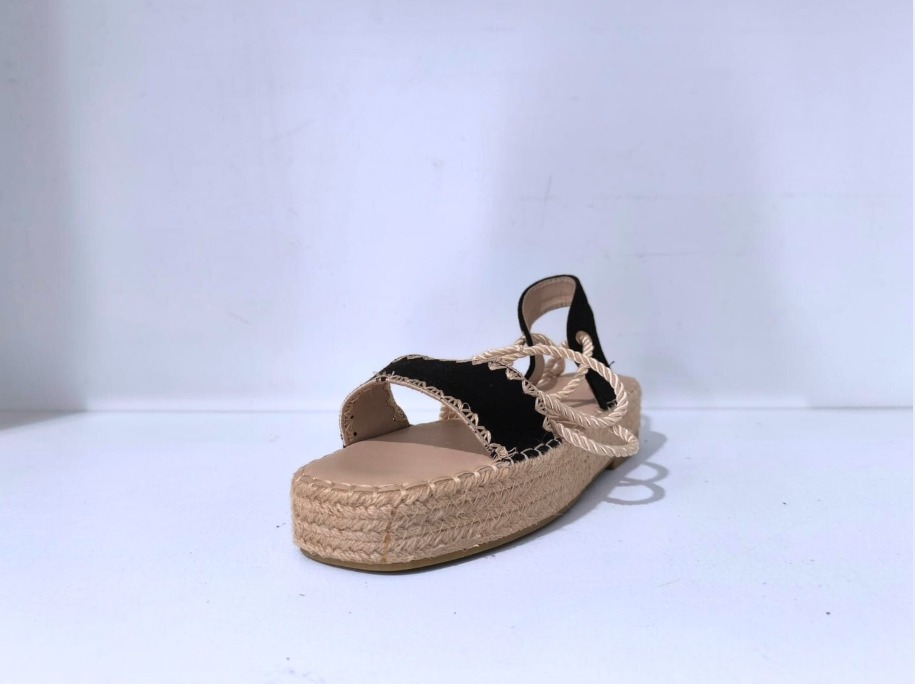 Sandalia tipo plataforma con diseño veraniego y moderno. Cuenta con una base forrada en yute trenzado que aporta un estilo natural y bohemio. La parte superior está compuesta por tiras en color negro con detalles de costura decorativa y cordones de cuerda ajustables que se anudan al tobillo para un toque artesanal y cómodo. Su suela es ligera y antideslizante, perfecta para caminar con seguridad y estilo durante los días cálidos.