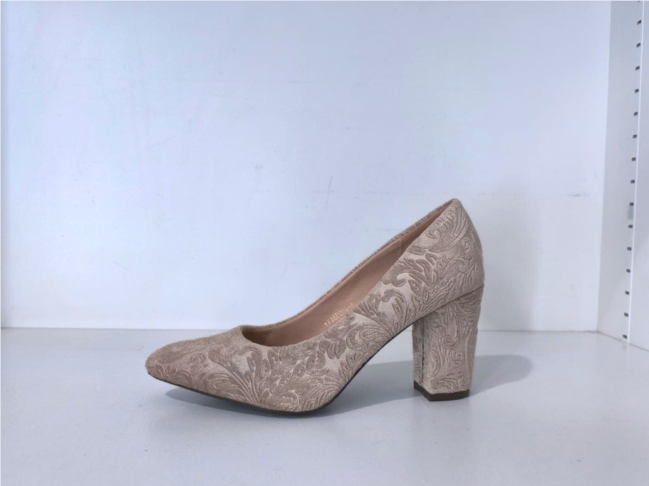 Zapato de mujer con diseño elegante y acabado texturizado en tono beige, decorado con un sutil relieve floral que aporta distinción y estilo. Su punta ligeramente afilada estiliza el pie, mientras que el tacón ancho y estable ofrece comodidad y seguridad al caminar. Confeccionado en materiales suaves y de alta calidad, este modelo combina sofisticación y confort, ideal para eventos formales, oficina o cualquier ocasión especial donde se busque un toque refinado y femenino.